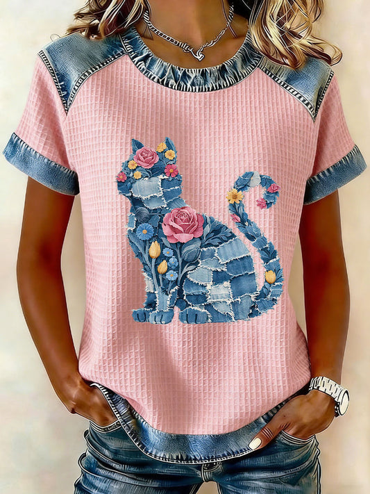T-shirt Décontracté Femme Chat Rose Ruban Imprimé