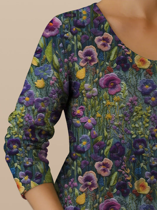 Top à gaufrage floral violet rétro décontracté pour femmes