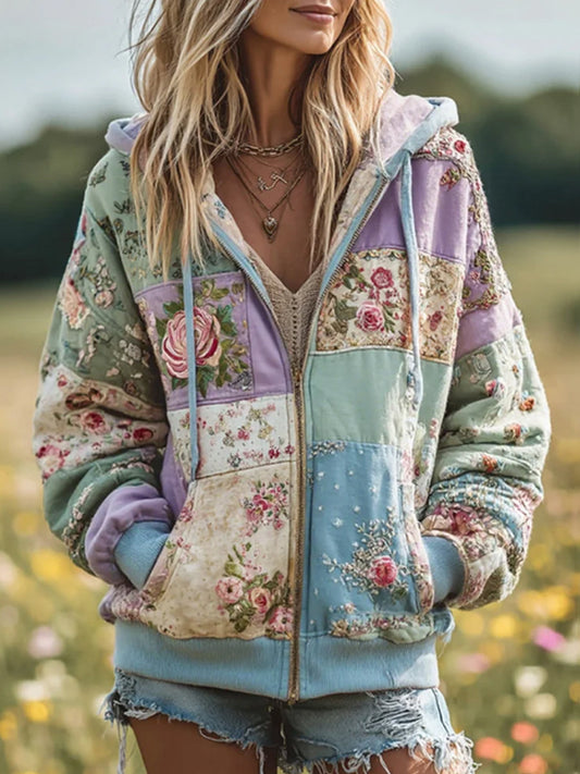 Vintage Floral Patchwork confortable chaud Zipper Hoodie des femmes