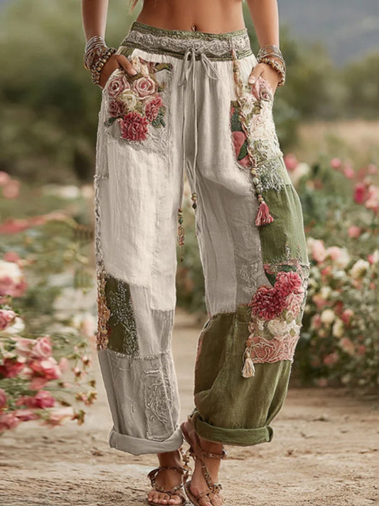 Femmes Vintage Rose et Floral Patchwork Art Lin Pantalon
