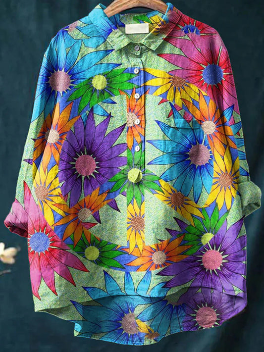 Retro Boho Floral Art Imprimé Vintage Chic Col V Bouton Poche Coton Chemise À Manches Longues