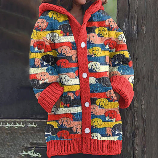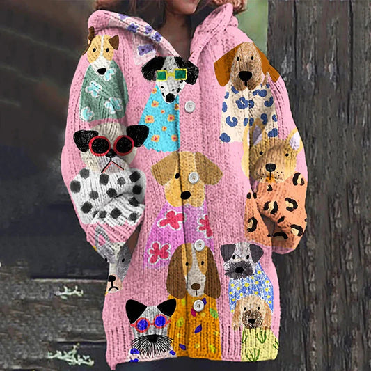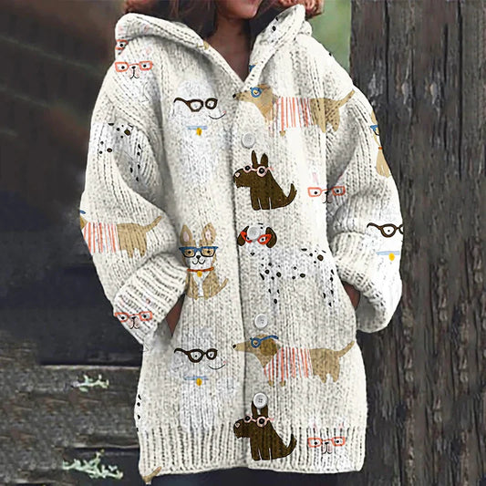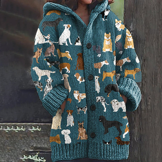 Rétro mignon Pet Print Button Up épais chandail à capuchon à manches longues Cardigan