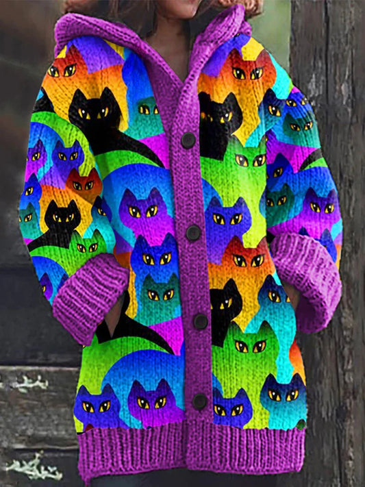 Motif de chat noir des femmes bouton Casual chaud Cardigan à capuche