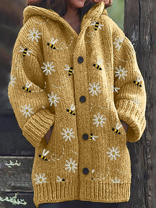 Abeille rétro imprimé floral boutonné épais à manches longues à capuche Cardigan Pull en tricot
