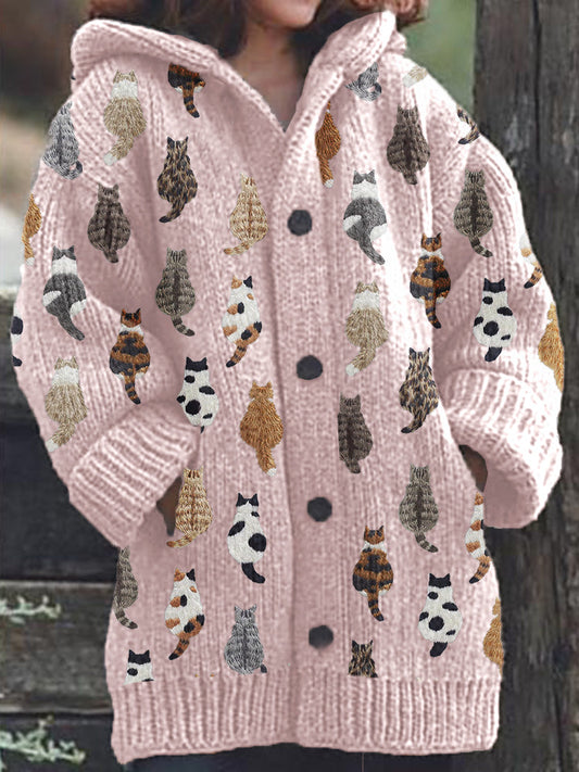 Rétro mignon Pet Print Button Up épais chandail à capuchon à manches longues Cardigan