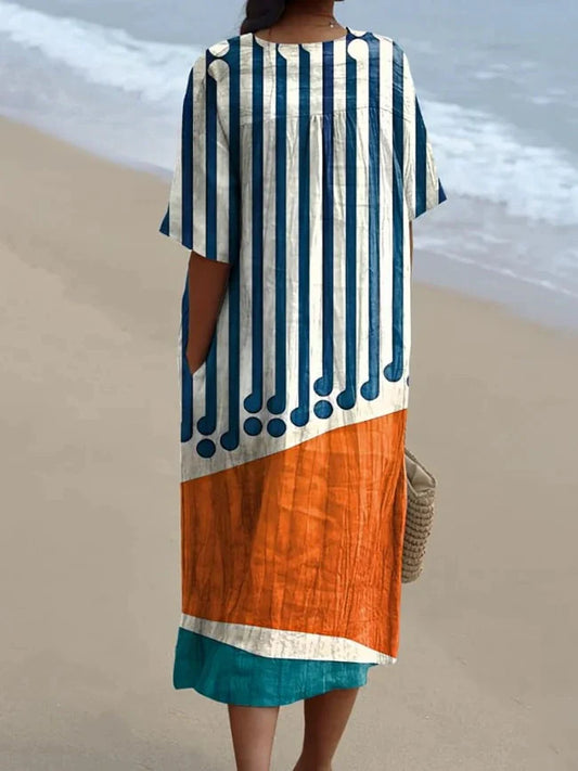 Rétro Boho Art Imprimé Col en V Vintage Loose Manches Courtes Midi Robe
