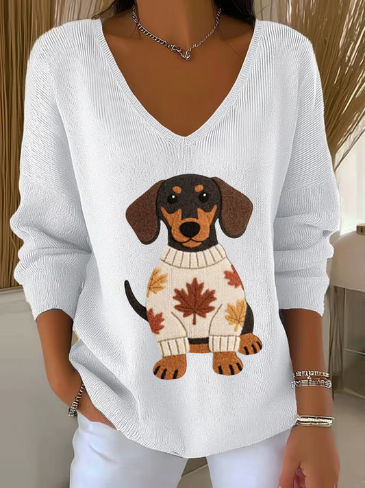 Femmes Automne Chien Art Imprimer V-Neck Haut côtelé