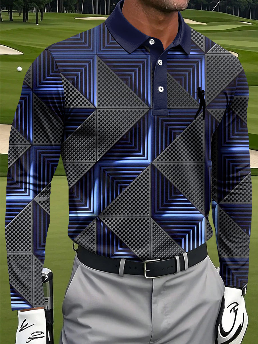 Polo à manches longues décontracté à imprimé géométrique symétrique rétro pour hommes